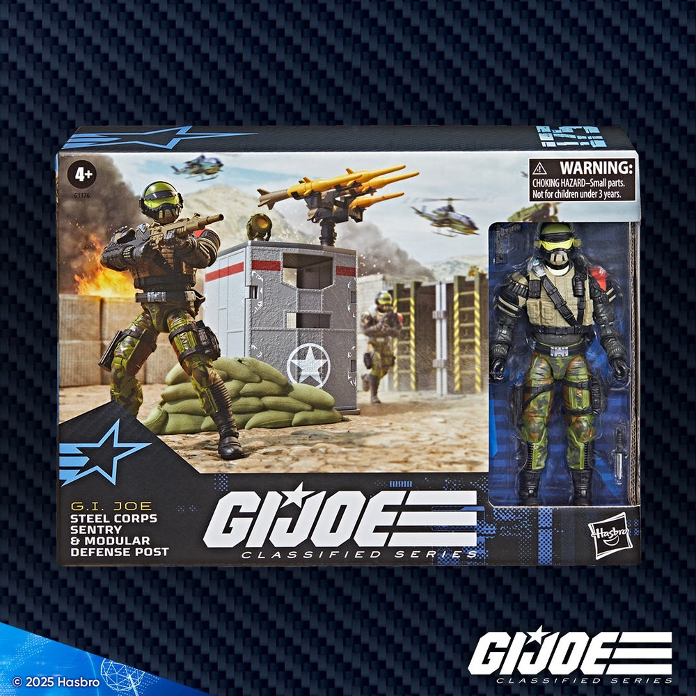 New to the G.I. Joe Classified Series line, Steel Corps Sentry & Modular Defense Post comes ready for adventure, with multiple points of articulation for high poseability. This Steel Corps Sentry figure comes with 3 character-inspired accessory pieces including knife and weapon accessories. The Modular Defense Post comes with 3 walls, floor, roof, and 41 accessory pieces including sandbag, weapons rack, 2 ladders, adjustable stands, satellite dish, search light, 4 missiles, ammo boxes, and weapon accessories; plus pegs, hinges, and connectors that also can attach to additional sets (Each sold separately) allowing you to create larger customized fortifications. Steel Corps Sentries are the guardian troopers who stop advancing enemies in their tracks.