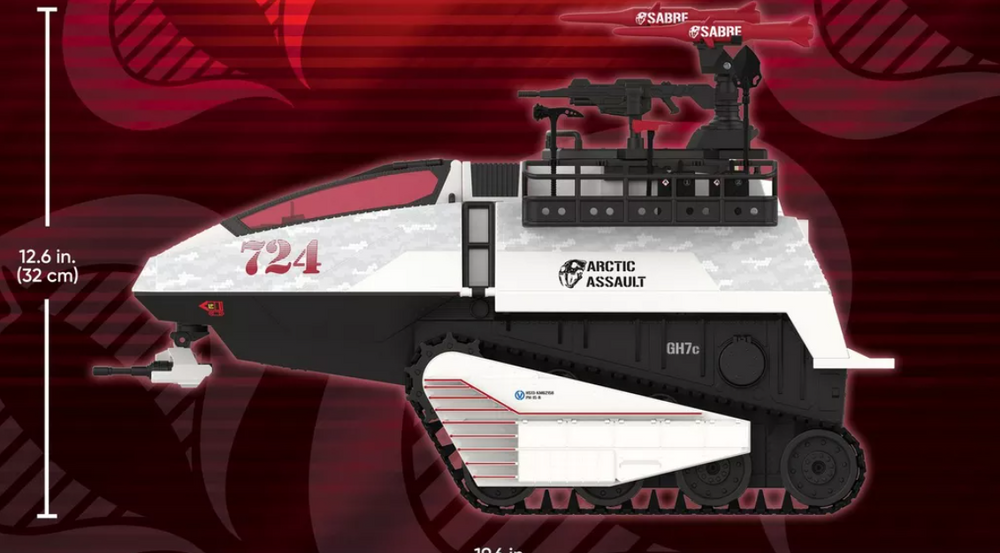 Lean and sleek, the Arctic Assault H.I.S.S. measures 19.6" (50 cm) long and stands 12.6." (32 cm) tall. The single cockpit seat affords a narrower silhouette than the Joe’s SnowC.A.T. while still providing ample rear cargo storage and troop transport at a mere 9" (22.9 cm) wide.