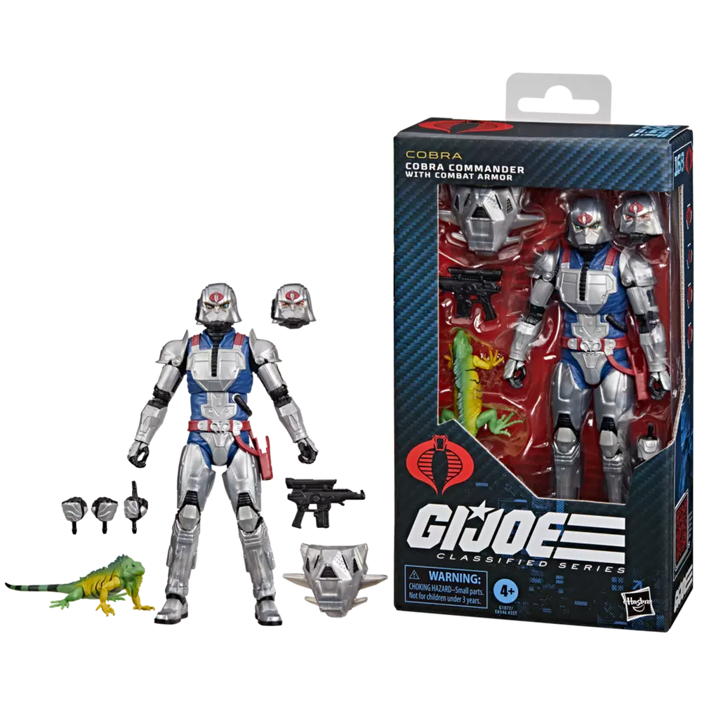 G.I. Joe is a highly skilled, on-demand, special operations force of men and women from around the globe tasked with defending the world from Cobra, a ruthless criminal organization bent on total domination. Wherever there’s trouble, G.I. Joe is there. New to the G.I. Joe Classified Series line, Cobra Commander With Combat Armor comes ready for adventure, with multiple points of articulation for high poseability. This Cobra Commander With Combat Armor figure contains 7 character-inspired accessory pieces including an alternate head to switch between human and serpent, 3 alternate hands, backpack, pet iguana ""Serpentor,"" and weapon accessory. To protect their leader in the heat of battle, the best technical minds of Destro's armament factory created a special suit of combat armor for Cobra Commander. It's rumored that his helmet has an anti-tamper device with a direct hook-up to a half-pound of plastic explosive.
