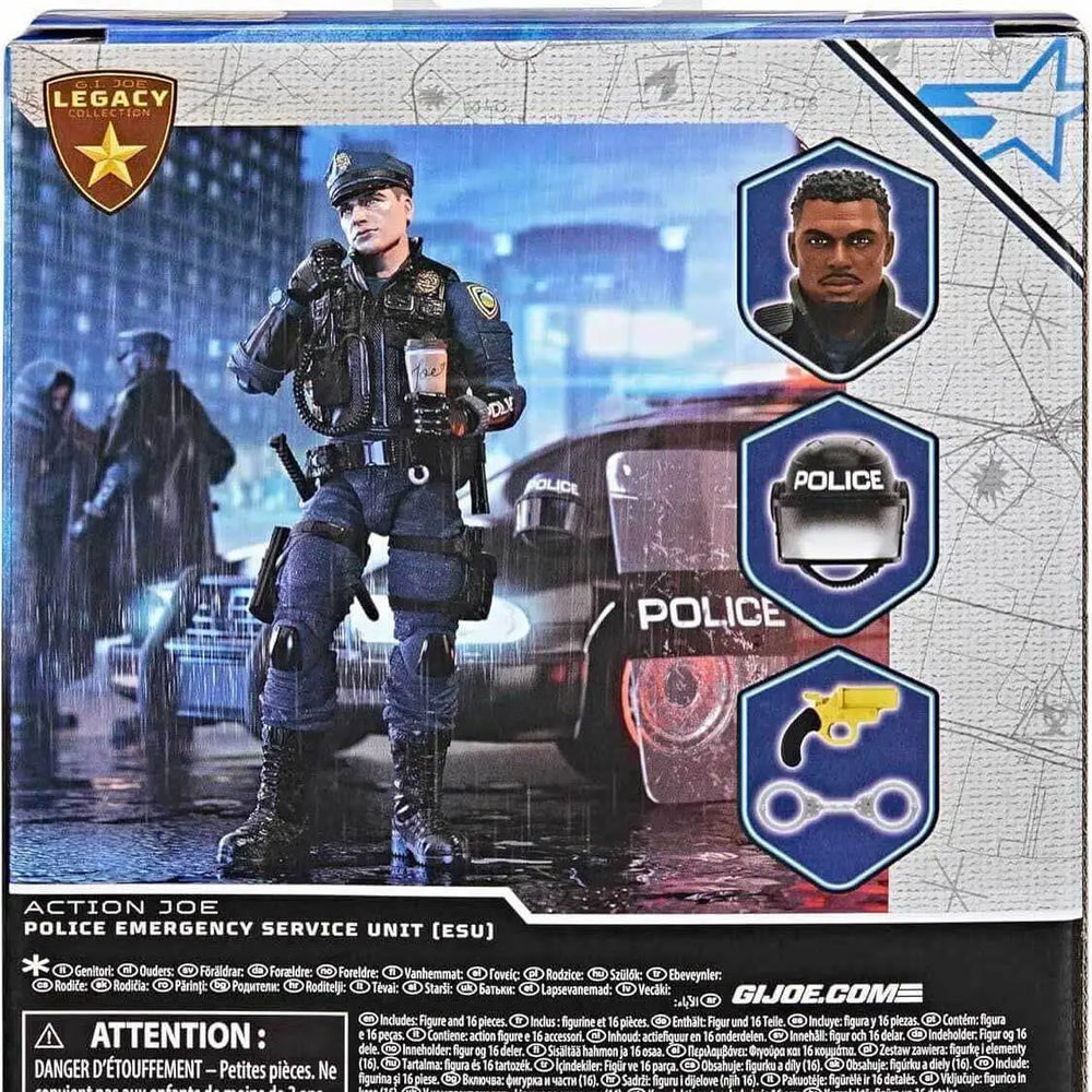 G.I. Joe debuted in 1964 with the Original Action Figure which left an indelible impression on generations and launched a toy franchise that continues to thrive finding new fans. The G.I. Joe Classified Series Legacy Collection continues that tradition by celebrating and recognizing everyday heroes such as first responders who brave danger to save lives, protect our communities, and strive to make the world a better place. New to the G.I. Joe Classified Series Legacy Collection line, Action Joe –Police Emergency Service Unit (ESU) comes ready for adventure, with multiple points of articulation for high poseability. This Police Officer figure is bursting with 14 character-inspired accessory pieces including alternate head, hat, handcuffs, nightstick, riot helmet and shield, 2 pairs of glasses, coffee cup, taser, flare gun, weapon accessories, and softgoods poncho as well as attached two-way radio transmitted. Police Emergency Service Unit (ESU) officers enforce the law in their mission to protect and serve, defending the lives and property of their fellow citizens.