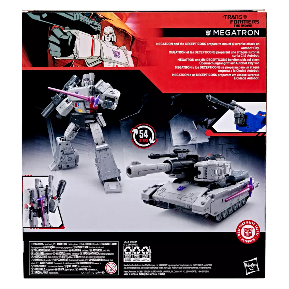 Experience the epic action of The Transformers: The Movie with the Transformers Studio Series Megatron toy! The 8.5-inch (21.5 cm) figure converts from robot action figure to tank mode in 54 steps. With movie-inspired details, intricate poseability, and attachable accessories like a fusion cannon and saber, this Megatron action figure makes an awesome addition to any collection. Look for more Transformers collectible toys (sold separately, subject to availability) featuring favorite characters like Optimus Prime, Bumblebee, Starscream, and more to create a lineup that is — More Than Meets the Eye.