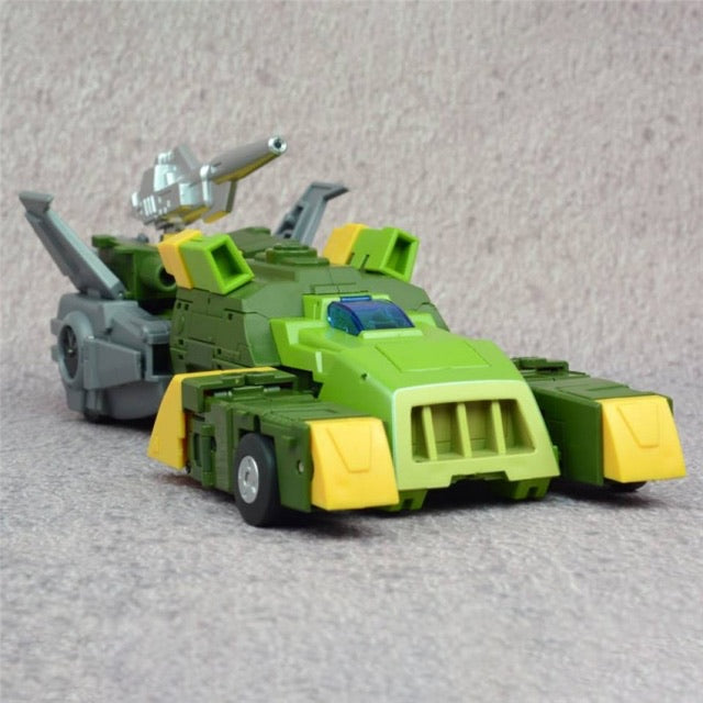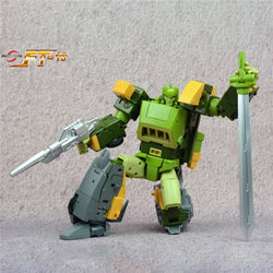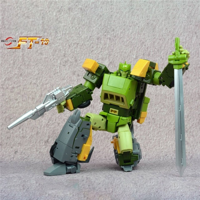 FT-19 Apache is a triple-changing robot that stands 9.60 inches tall in robot mode. His two alternate modes are a helicopter and an armored vehicle. Apache features several die-cast parts and comes armed with a blaster rifle and sword.