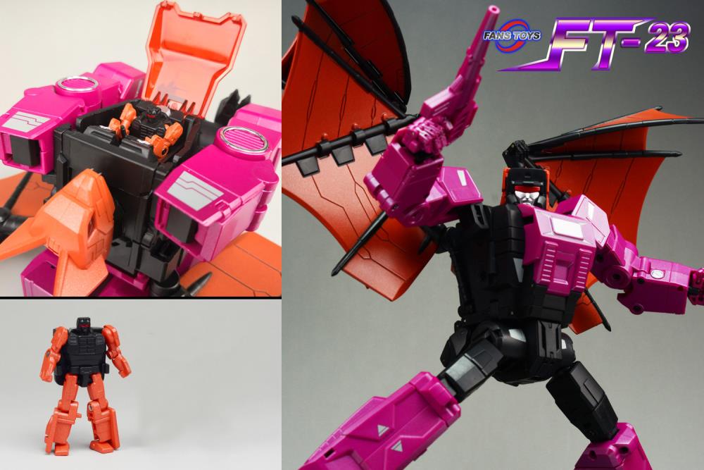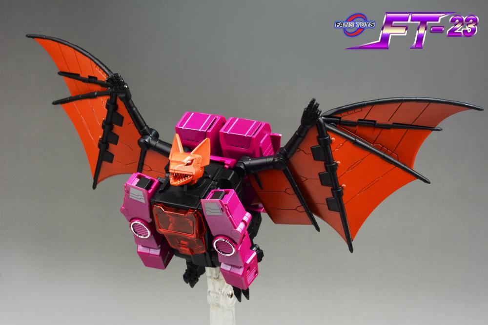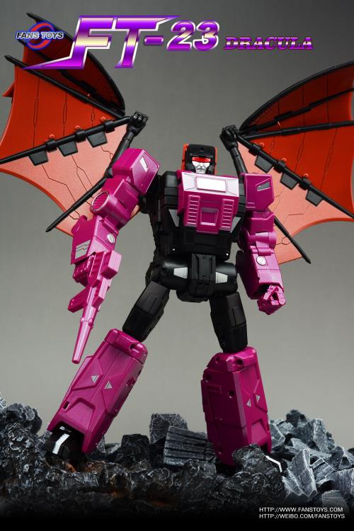 FT-23 Dracula from Fans Toys is a highly articulated, fully transformable robot that that stands over 9 inches tall. Armed with a blaster pistol, Dracula transforms into a giant bat and features a detachable head that is able to transform into a mini robot.