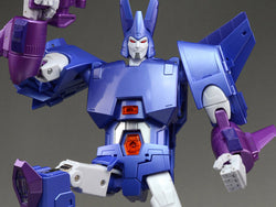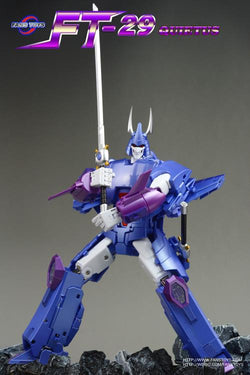 FT-29 Quietus from Fans Toys is a highly articulated, fully transformable robot that that stands over 9 inches tall. Armed with a blaster rifle and a pair of katanas, Quietus transforms into a space jet and features a mini robot that is able to transform into an additional weapon.