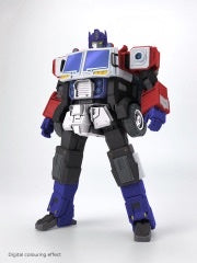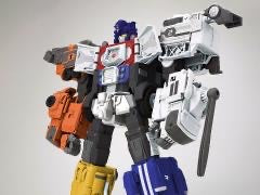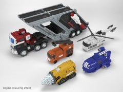 This fully articulated figure can transform from a semi with a trailer into a robot and back again. Once in robot form the figure can be combined with the four transformable drone vehicles to form the Energy Commander. The drone vehicles are interchangeable and can be combined with the main figure in several different configurations. The trailer itself can transform into a base and a battle station that can be used with the included mini robot.