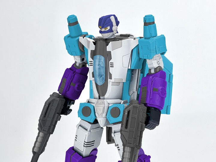 From Fans Hobby comes the Master Builder MB-23A Fight Storm converting robot. This robot features a light blue, white, and purple color scheme and can convert into a jet plane. This highly detailed Fright Storm figure is a terrific addition to any collection.