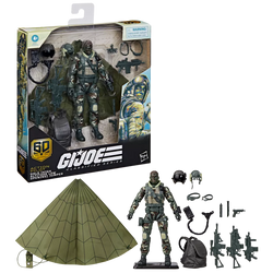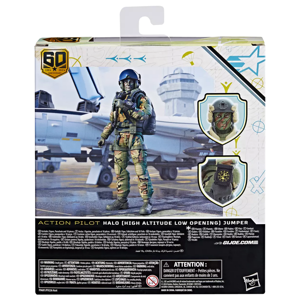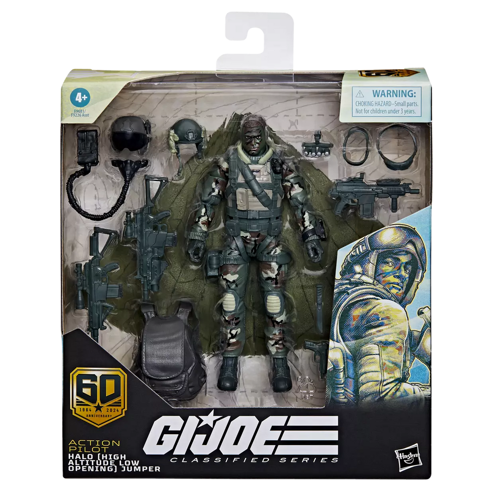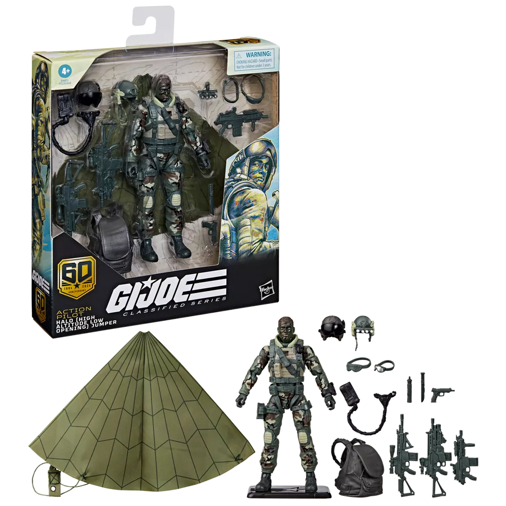 G.I. Joe debuted in 1964 with the Original Action Figure honoring the members of America’s military. The Action Soldier, Sailor, Marine, and Pilot left an indelible impression on generations and launched a toy franchise that continues to thrive finding new fans. In celebration of its 60th Anniversary, G.I. Joe is reaching back into its storied past to bring those movable fighting forces into the modern era. New to the G.I. Joe Classified Series line, 60th Anniversary Action Pilot - HALO (High Altitude Low Opening) Jumper comes ready for adventure, with multiple points of articulation for high poseability. This Pilot figure is bursting with 18 character-inspired accessory pieces including visored helmet with air hose, alternate helmet with night vision goggles, removable pouch, wrist altimeter, goggles, figure stand, and multiple weapon accessories; plus a foldable soft goods display parachute that can stow in the backpack. The G.I. Joe Action Pilot acts as a guardian of freedom and justice, never faltering, never failing, and never leaving a fellow behind.