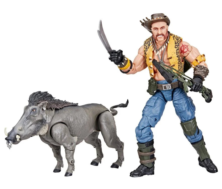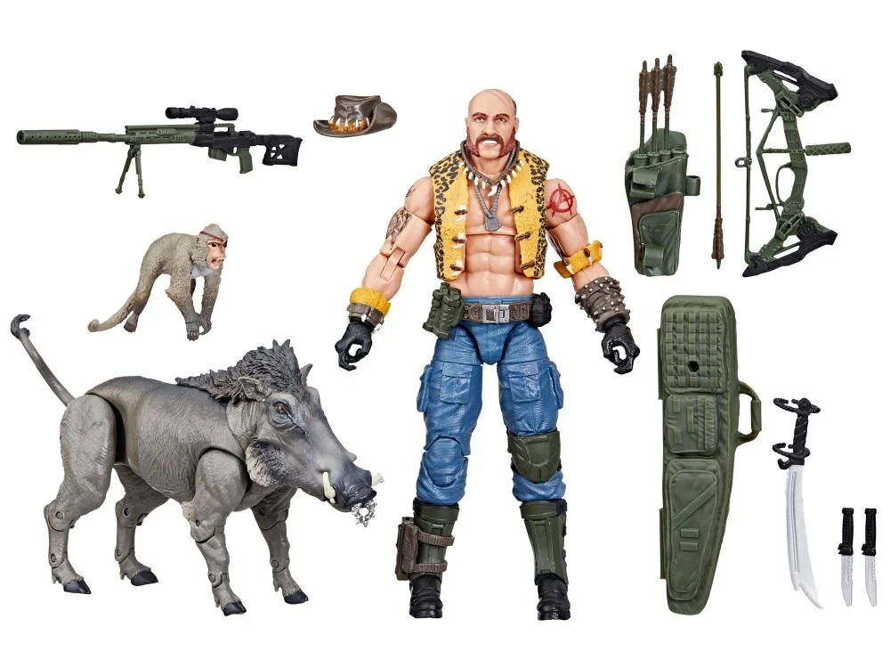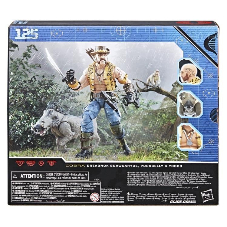 G.I. Joe is a highly skilled special operations force of men and women from around the globe tasked with defending the world from Cobra, a ruthless criminal organization bent on total domination. Wherever there’s trouble, G.I. Joe is there. New to the G.I. Joe Classified Series line, Dreadnok Gnawgahyde and pets Porkbelly & Yobbo come ready for adventure, with multiple points of articulation for high poseability. This Gnawgahyde figure contains 16 accessory pieces including bow, quiver, arrow, 2 knives, machete with wrist attachment, slouch hat, sniper case, and weapon accessory; plus pet warthog Porkbelly and macaque Yobbo. Gnawgahyde could have single-handedly decimated the herds of all the endangered species of Africa, if his fellow poachers hadn’t railroaded him off the continent for cheating at cards, being generally obnoxious, and smelling bad. With the help of flatulent warthog Porkbelly and surly macaque Yobbo, he kept solvent by stealing furs until the Dreadnoks recruited him.