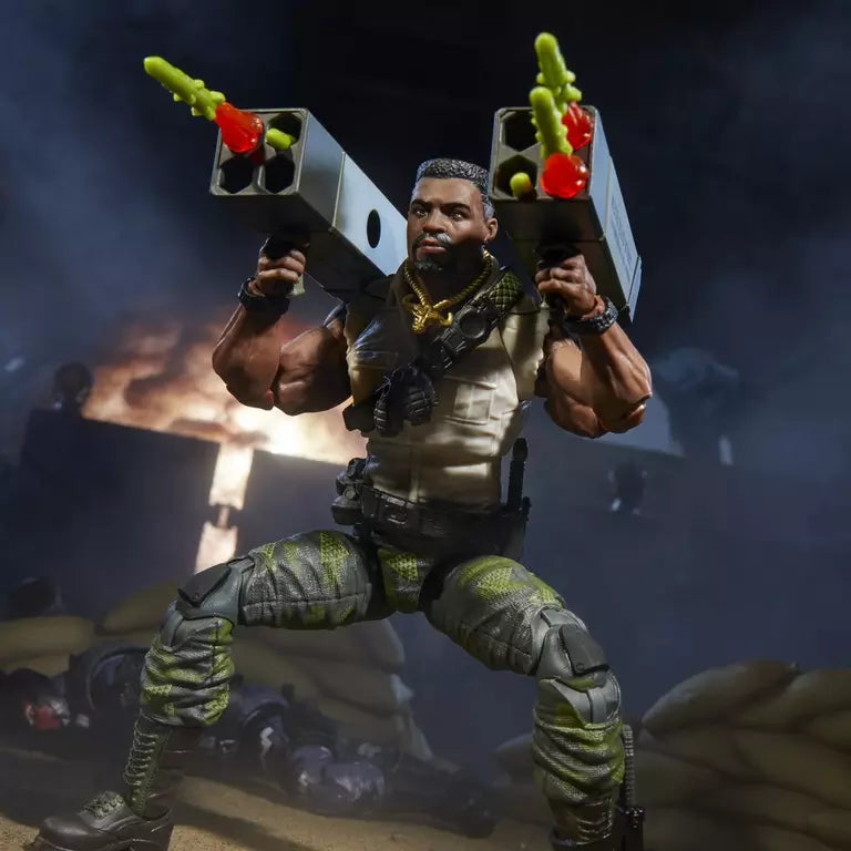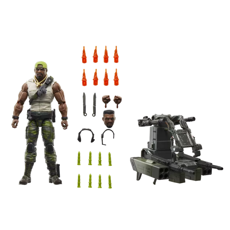 G.I. Joe is a highly skilled, on-demand, special operations force of men and women from around the globe tasked with defending the world from Cobra, a ruthless criminal organization bent on total domination. The brave members of G.I. Joe are prepared to seek out Cobra in any environment on the planet. From hostile jungles to ice-clad arctic peaks…wherever there’s trouble, G.I. Joe is there. New to the G.I. Joe Classified Series line, Heavy Duty comes ready for adventure, with multiple points of articulation for high poseability. This Heavy Duty Deluxe figure set is bursting with 30 character-inspired accessory pieces which attach to him and his Man-Portable Heavy Weapons System. Included are 2 detachable M202 Quad Burst missile launchers, 8 missiles, 8 blast effects, 2 laser cannons, ammo belt, 2 rotary cannons, 2 knives, an alt head, 2 alt hands, headphones, and range finder.