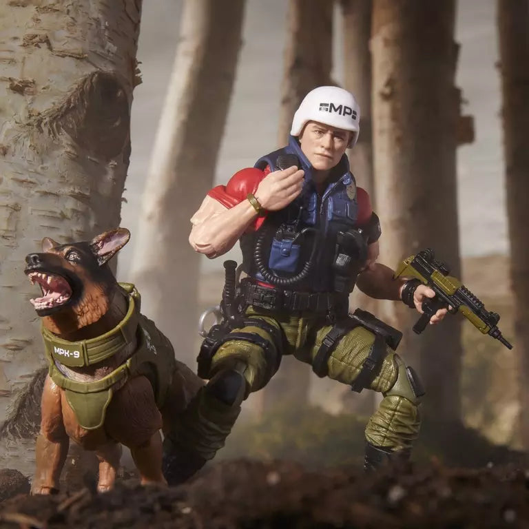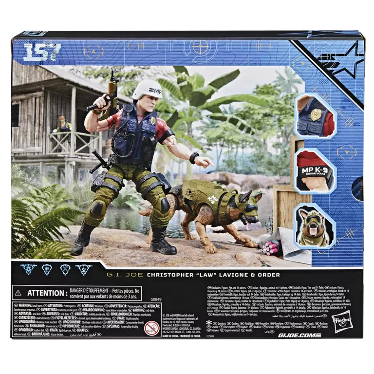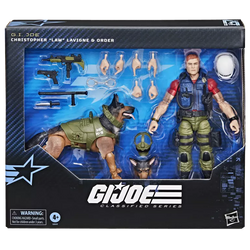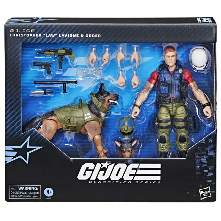 G.I. Joe is a highly skilled, on-demand, special operations force of men and women from around the globe tasked with defending the world from Cobra, a ruthless criminal organization bent on total domination. The brave members of G.I. Joe are prepared to seek out Cobra in any environment on the planet. From hostile jungles to ice-clad arctic peaks…wherever there's trouble, G.I. Joe is there. New to the G.I. Joe Classified Series line, Christopher ""Law"" Lavigne & Order come ready for adventure, with multiple points of articulation for high poseability. This Christopher ""Law"" Lavigne & Order figure pack contains 14 character-inspired accessory pieces including 6 alternate hands for dog command signals, nightstick, handcuffs, helmet, knife, and weapon accessories. K-9 Order includes both a ""good boy"" head and alternate growling head, goggles, removable collar and harness. G.I. JOE and HASBRO and all related trademarks and logos are trademarks of Hasbro, Inc.