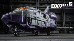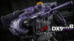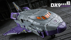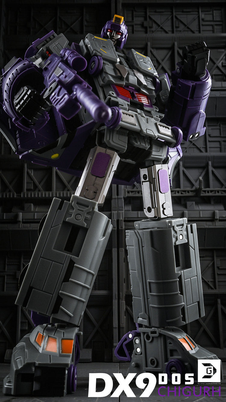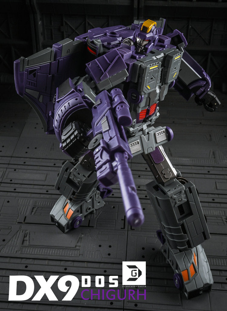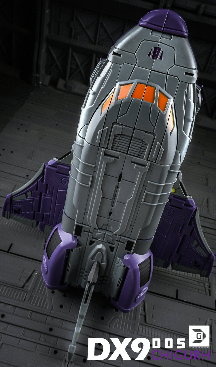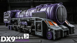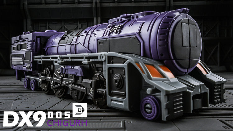 DX9 D05 Chigurh stands 24cm / 9.6" tall in robot mode and converts from space shuttle to train to robot. This figure contains die-cast metal parts, the waist is twistable and the wheels rotate.